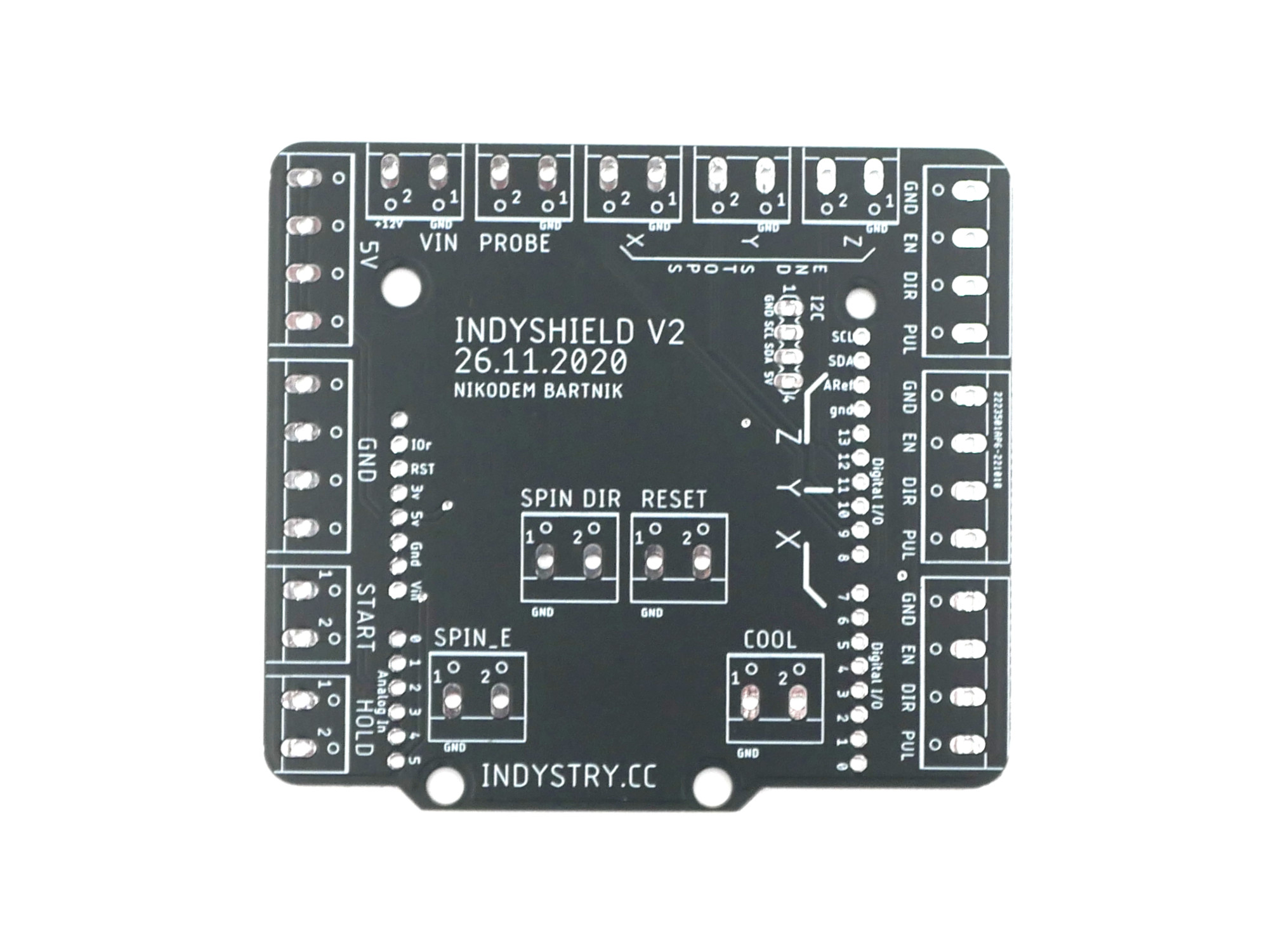 IndyShield to prosta, kompatybilna z GRBL nakładka dla Arduino, wyposażona w złącza śrubowe, które ułatwiają podłączanie dużych sterowników silników krokowych (TB6600, DM556), sterowania wrzecionem oraz przycisków. Powstała z myślą o sterowaniu moją frezarką IndyMill, jednak z powodzeniem może być wykorzystana w każdej maszynie CNC, a także w dowolnym projekcie wymagającym obsługi silników krokowych. Przy projektowaniu postawiłem na maksymalną prostotę, dzięki czemu lutowania jest bardzo niewiele i nawet początkujący poradzi sobie z montażem bez problemów.