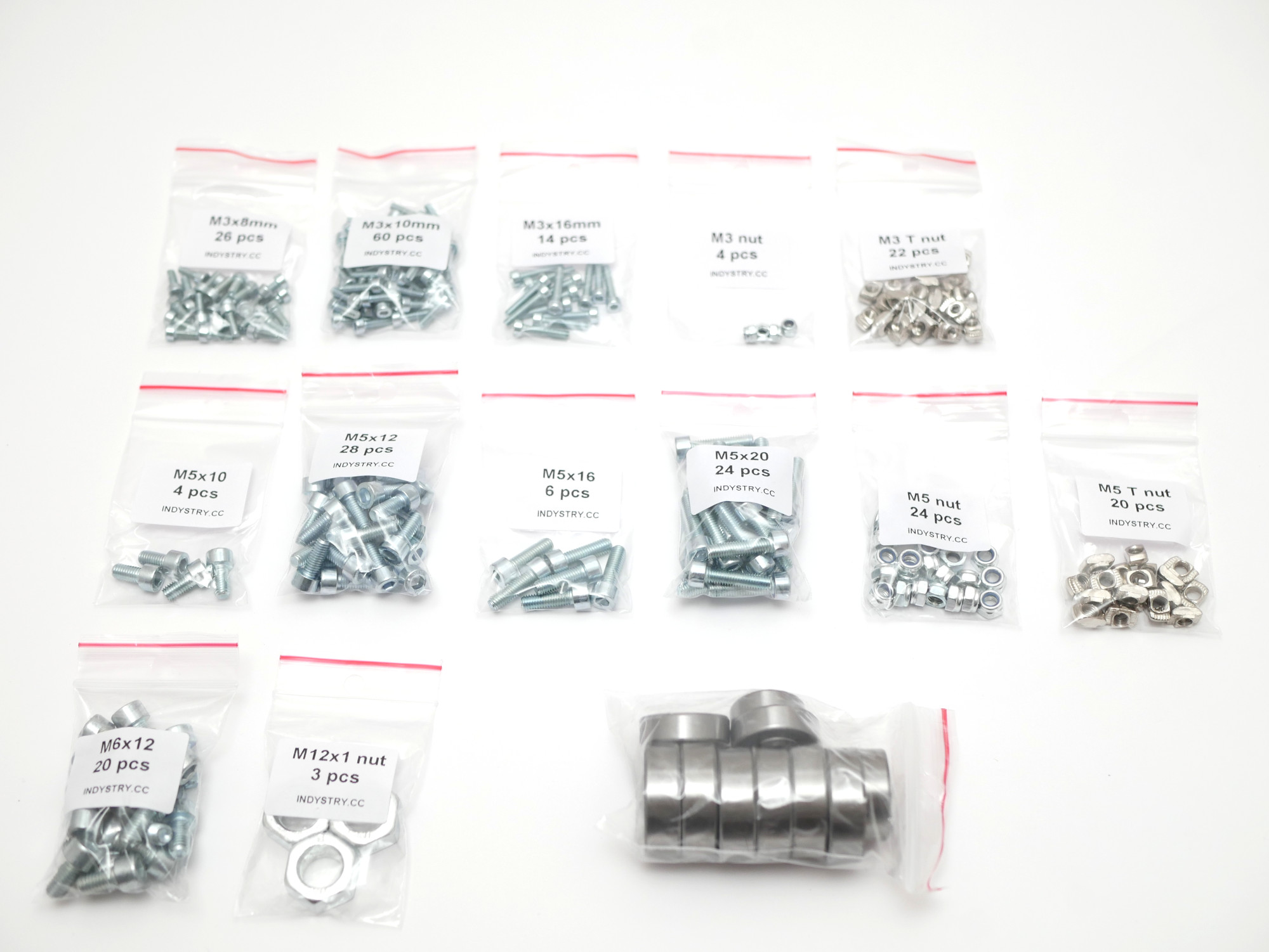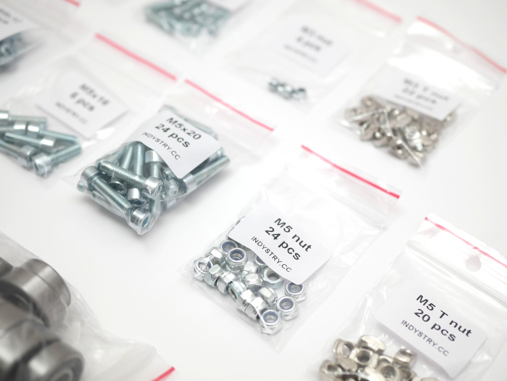 To jest zestaw śrub i łożysk do IndyMill. Zamawianie odpowiednich rozmiarów i długości śrub (często z różnych sklepów) potrafi być uciążliwe. Właśnie dlatego stworzyłem ten zestaw! Wszystko dokładnie policzone i ładnie opisane aby bez problemu przystąpić do składania frezarki IndyMill.